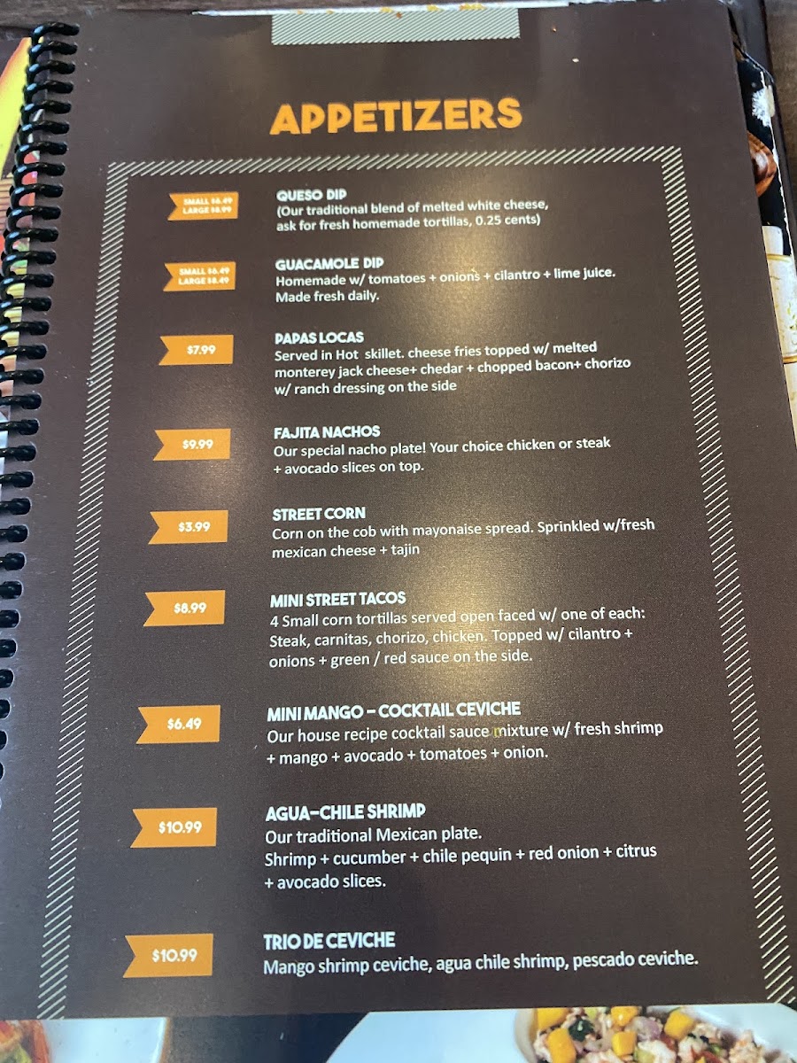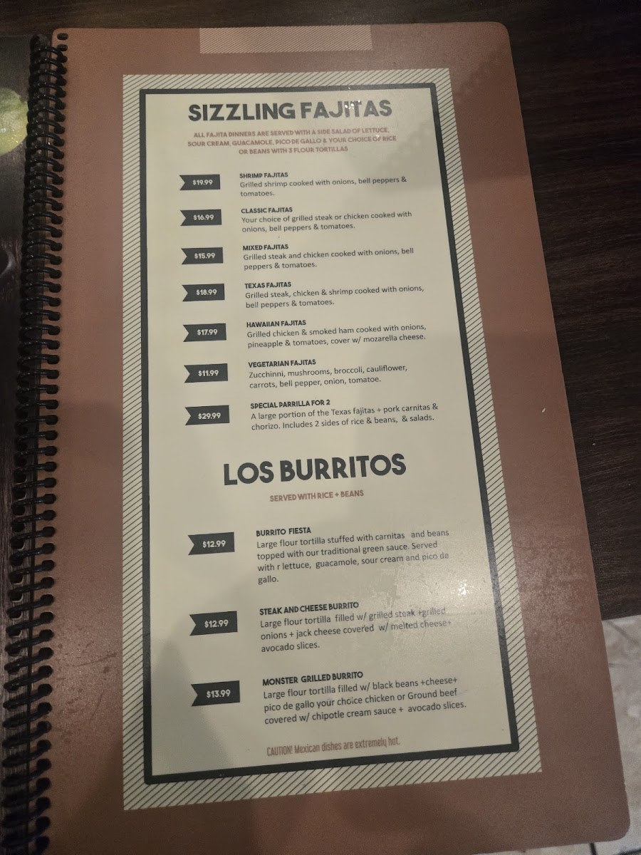 Gilled chicken or steak, cooked w/ tomatoes + onions + bell peppers. Served w/ rice, beans + lettuce + sour cream + homemade guacamole + pico de gallo + flour tortillas.