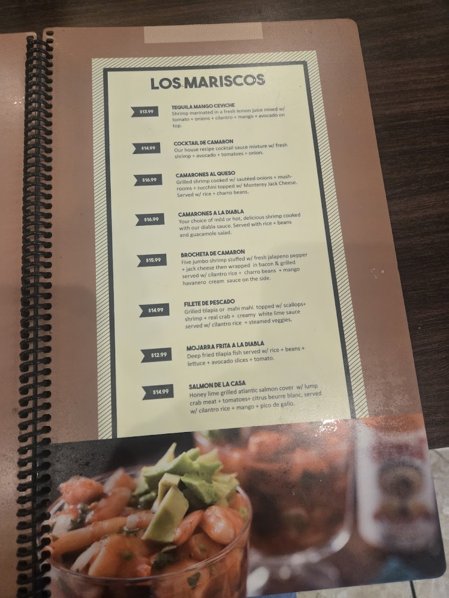 Grilled shrimp cooked w/ sautéed onions + mushrooms topped w/ monterey jack cheese. Served w/ rice + charro beans.
